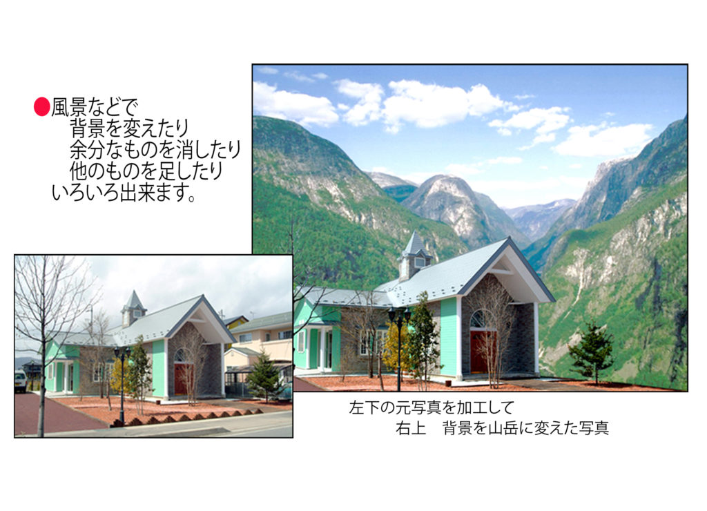 写真の加工 建造物の背景処理・電線等余分なものを消したり他のものを足したり、古い建物の写真を再生も出来ます。 加工技術 空中の電線を消す加工 空を夕焼けに加工 商店通りの古い店舗を新しく 他にも色々な加工が可能です。ご相談・お問合せは こちらまで